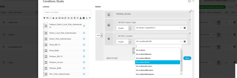 One of the most commonly used NDG types is Device:Location, which allows you to tie the NAD and its associated AAA transactions to any logical or physical location you deem appropriate; “LAB-Floor2Rack3” or “Boston, MA”, for example. NAD location provides a handy label you can then use to differentiate AAA requests coming into ISE from NADs associated with that location; perhaps you want to apply a different policy set to wireless authentication requests coming from London vs those coming in from Singapore, or even split out authentication from one location vs another to different Identity Source Sequences within a single Policy Set – there are many options available to you.