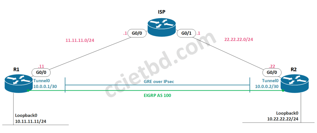 This article will look at a basic configuration for a route-based VPN between two Cisco IOS routers, using IKEv1 and IPsec for tunnel protection, and EIGRP for dynamic route advertisements based on the above topology.