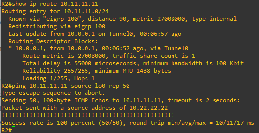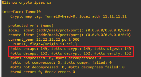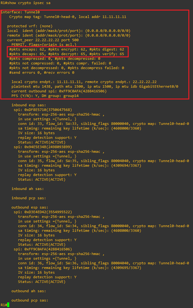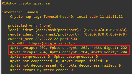 From R1, we can check the current encap/decap stats on the Phase 2 tunnel, then from R2‘s Lo0 IP we can send some pings to R1‘s Lo0 IP. Since this should only be reachable across the tunnel, we should see encap/decap incrementing.