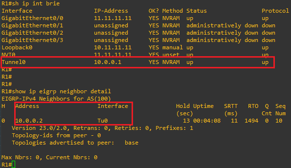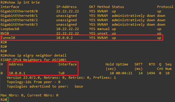 Now let’s see if our basic GREoIP tunnel is up/up and check that EIGRP has formed an adjacency across the tunnel:
