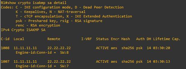 From R1 we can see the ISAKMP security associations are up, indicating that the IKEv1 Phase 1 tunnel is established: