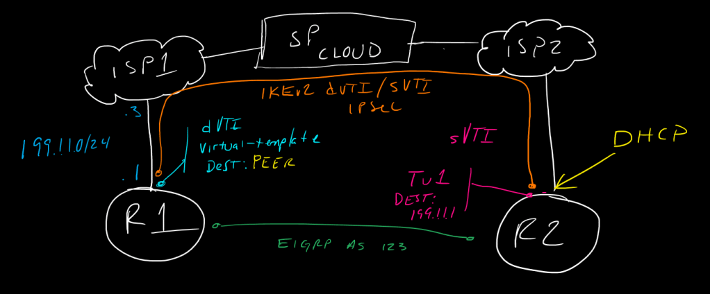 !In a typical sVTI or GREoIPSec point-to-point VPN tunnel, we generally know the external/initiating identity IP of each peer router, and we can configure this on the tunnel interface as the tunnel destination IP. In a scenario where we know one of the router IPs but we do not know the IP of the peer (perhaps it is dynamically assigned for example, and may change periodically), we cannot use sVTI and would need to use a multipoint-gre configuration on the statically-assigned headend router, such as is done commonly in DMVPN. While we can do multipoint-GRE over IPSec using IKEv2, if we want to optimize the headers and avoid enveloped ESP + GRE + IP encapsulation, we would ideally want to use static-VTI config, aka native IPSec tunnels - this is where dynamic VTI (dVTI) comes in.